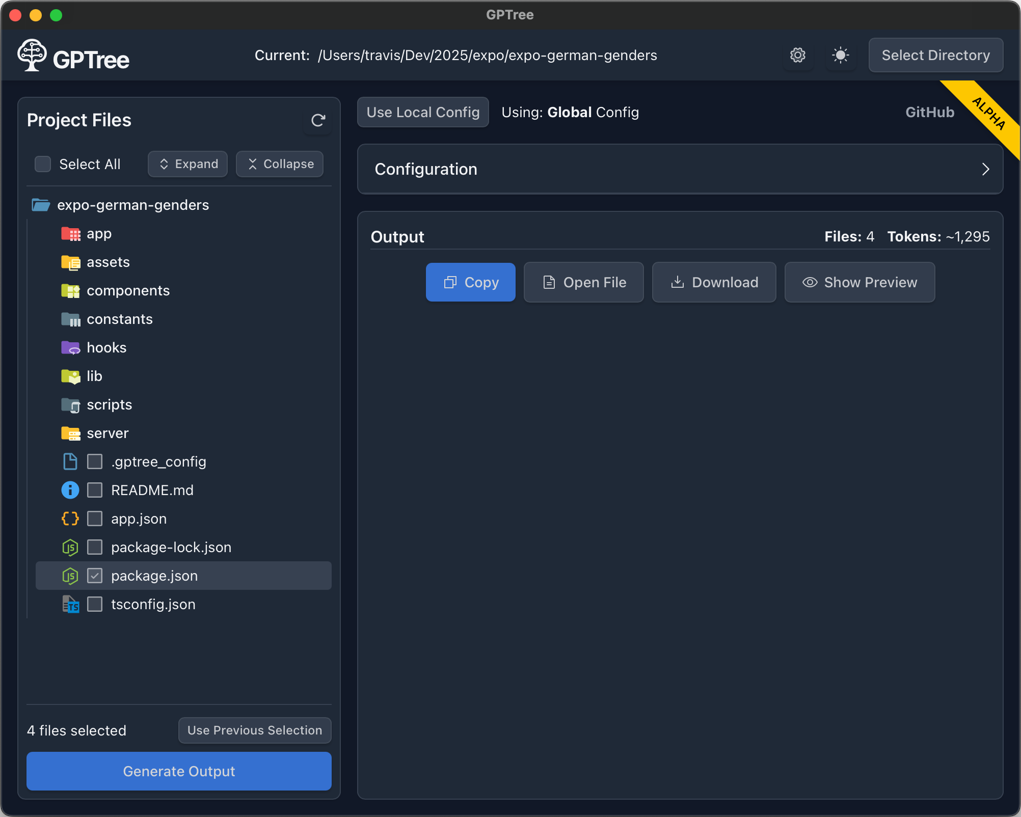 Cross-platform desktop app that helps developers visually select files from any codebase and generate clean, structured context for use with AI models like GPT. Designed for speed and clarity, GPTree (GUI) combines a sleek React interface with a native Rust backend using the ultra-lightweight Tauri framework.