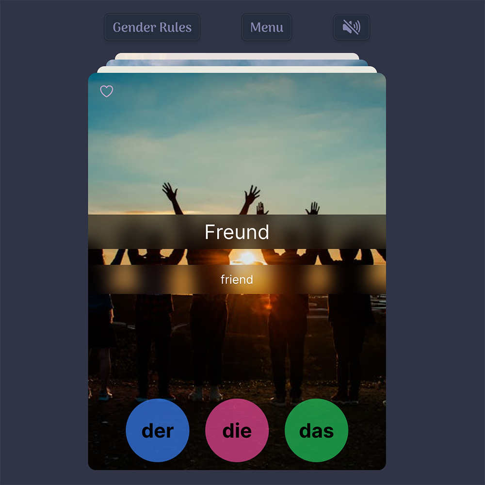 Master the gender of German nouns through an addictive flashcard-like app that offers insights to common patterns to enhance retention.